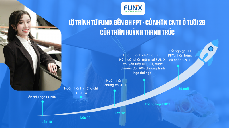 Thanh Trúc – cô gái đến từ Cần Thơ – bắt đầu học chương trình Core Software Engineering tại FUNiX từ lớp 10. Suốt ba năm phổ thông, nữ sinh hoàn thành lần lượt các học phần, có thể quy đổi sang tín chỉ tại Đại học FPT. Chỉ sau hai năm học xong THPT, Trúc đã hoàn thành toàn bộ lộ trình học và đồ án tốt nghiệp tại Đại học FPT – chính thức trở thành tân cử nhân IT ở tuổi 20.