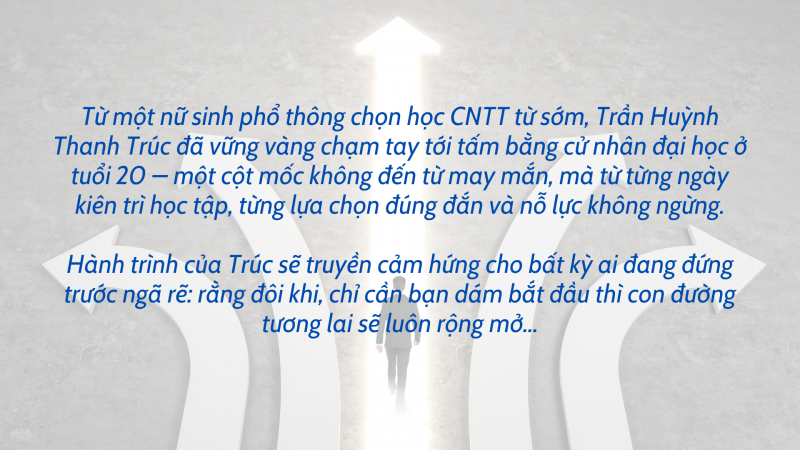 Đằng sau cột mốc ấn tượng ấy là một chặng đường đầy nỗ lực, và không ít áp lực phải vượt qua. Nhưng cũng chính hành trình này đã rèn luyện cho Trúc tinh thần tự học, khả năng thích nghi và một tư duy trưởng thành “không đợi tuổi”. Và điều đáng quý nhất, cô bạn tốt nghiệp đại học ở tuổi 20 tuổi đang từng bước hiện thực hóa ước mơ sự nghiệp bằng chính nội lực và đam mê của mình.