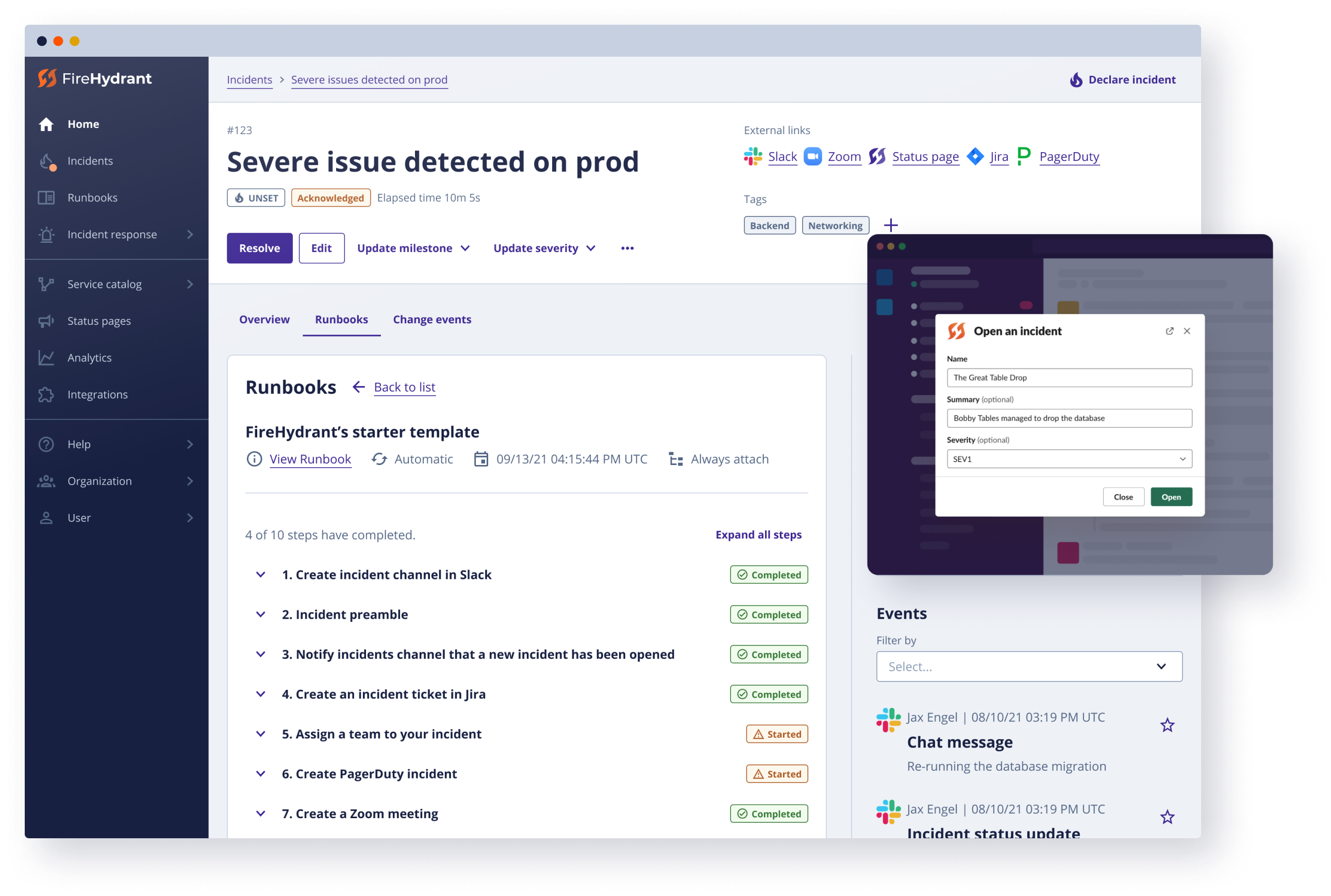 FireHydrant là một phần mềm cho dev team khác mà bạn nên tham khảo. Đây là công cụ giúp “dập tắt đám cháy” cho dự án, xử lý các vấn đề trong hệ thống như giúp lập tài liệu hệ thống, tích hợp các công cụ bạn đã sử dụng, thu thập dữ liệu và cảnh báo để xử lý các sự cố. Với FireHydrant, bạn có thể tự động hóa quy trình xử lý sự cố, ví dụ: tạo phòng Slack mới, cập nhật trang trạng thái hoặc cầu thu phóng.