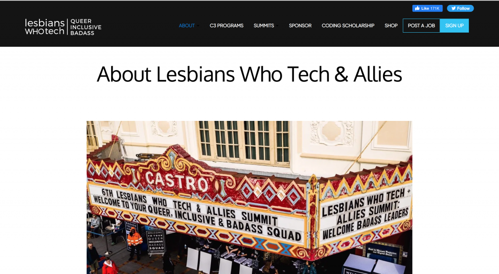 Đây là cộng đồng dành cho những phụ nữ thuộc LGBTQ+ (bao gồm người đồng tính nữ, chuyển giới) trong lĩnh vực công nghệ. Mục tiêu của Lesbians Who Tech là giúp mọi người thuộc cộng đồng này có cơ hội gặp gỡ, kết nối với ngay nhiều hơn và giúp đỡ nhau trong công việc có liên quan đến công nghệ, cũng như mở ra cơ hội việc làm tại các công ty, tổ chức. Mỗi năm, LWT tổ chức một hội nghị thượng đỉnh tập trung vào công nghệ và trao học bổng dành cho phụ nữ LGBTQ+ về viết code, bao gồm 50% học phí cho một chương trình đào tạo về coding.
