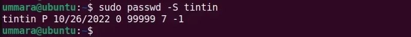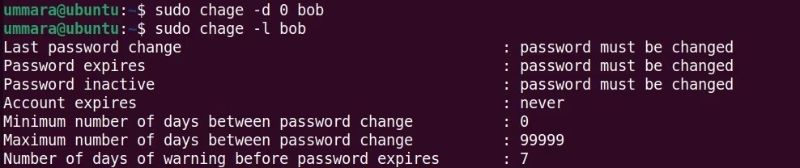 Lệnh này sẽ ngay lập tức vô hiệu hóa mật khẩu hiện tại của người dùng. Bây giờ nếu bạn xem thông tin “độ tuổi” mật khẩu, nó sẽ cho bạn biết rằng người dùng phải thay đổi mật khẩu.