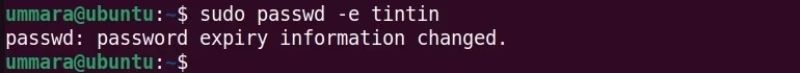 Để đặt mật khẩu của người dùng hết hạn và buộc họ phải thay đổi mật khẩu ở lần đăng nhập tiếp theo, hãy sử dụng lệnh passwd với tùy chọn -e hoặc –expire:
