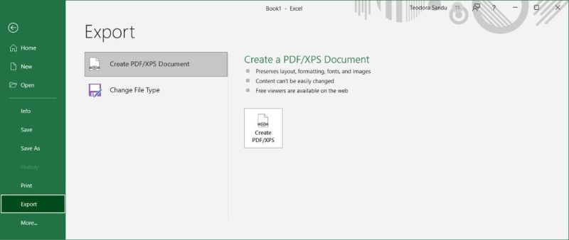 Tùy chọn này tương tự như tùy chọn đầu tiên, vì bạn có thể xuất tệp dưới dạng PDF bằng các công cụ Excel. Từ thanh công cụ, mở tab Tệp (File). Sau đó, chọn Xuất (Export) và nhấp vào Tạo tài liệu PDF/XPS (Create PDF/XPS Document). Sau khi bạn chọn vị trí tệp, hãy nhấp vào Xuất bản (Publish) và Excel sẽ biến bảng tính thành tệp PDF.