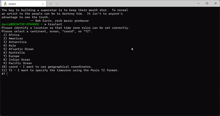 Bạn bắt đầu với lệnh tzselect tại shell: