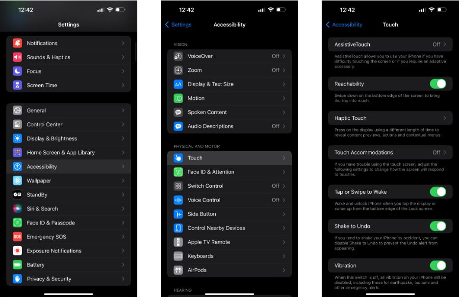 Tính năng Shake to Undo được bật trong iOS và iPadOS theo mặc định. Tuy nhiên, nếu việc lắc iPhone của bạn không làm xuất hiện cửa sổ bật lên, hãy đảm bảo rằng nó được bật trong Cài đặt > Trợ năng > Chạm > Lắc để hoàn tác (Settings > Accessibility > Touch > Shake to Undo).