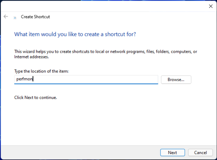 - Nhập perfmon trong trường Type the location of the item và nhấp vào Next.
