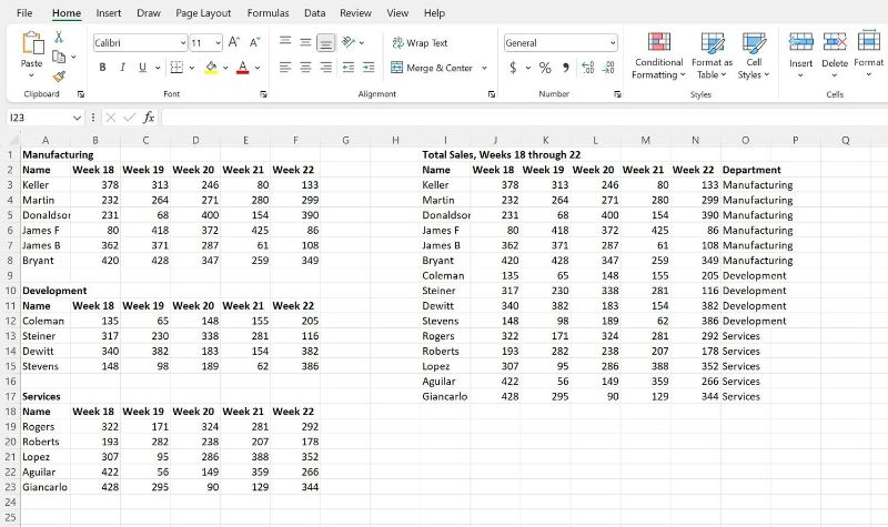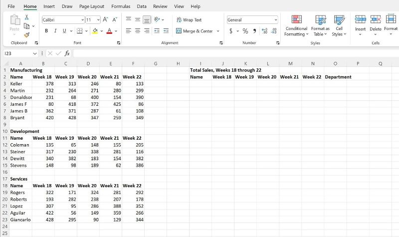 Trong ví dụ minh họa này, giả sử có ba bảng dữ liệu bán hàng được nhập từ mỗi bộ phận. Người đứng đầu bộ phận bán hàng muốn xem tổng quan về tổng doanh số bán hàng của tất cả mọi người từ tất cả các bộ phận, vì vậy chúng ta cần hợp nhất ba bảng này lại với nhau thành một tập dữ liệu lớn.