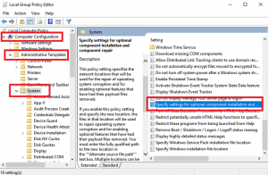 Quan sát bảng điều khiển bên phải, kéo xuống tìm entry (mục) có nhãn Specify settings for optional component installation and component repair (Chỉ định cài đặt để cài đặt thành phần tùy chọn và sửa chữa thành phần). Bạn sẽ tìm thấy nó bên dưới các thư mục ở đầu danh sách.