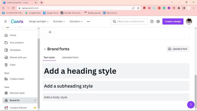 Để tải phông chữ lên Canva, hãy đăng nhập vào canva.com và chuyển đến Brand Kit trong bảng điều khiển bên cạnh. Kéo xuống cuối màn hình cho đến khi bạn đến phần “Brand fonts”.