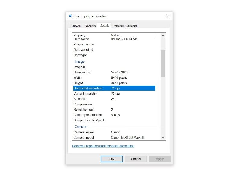 - Cuộn xuống cho đến khi bạn đạt đến hai thuộc tính được gọi là Horizontal Resolution (Độ phân giải ngang) và Vertical Resolution (Độ phân giải dọc). Chúng phải có các giá trị DPI giống nhau. Đây là độ phân giải in của hình ảnh hoặc dự án của bạn.