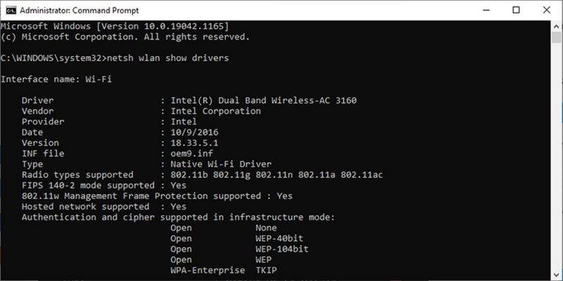 - Trong cửa sổ Command Prompt, gõ netsh wlan show drivers.