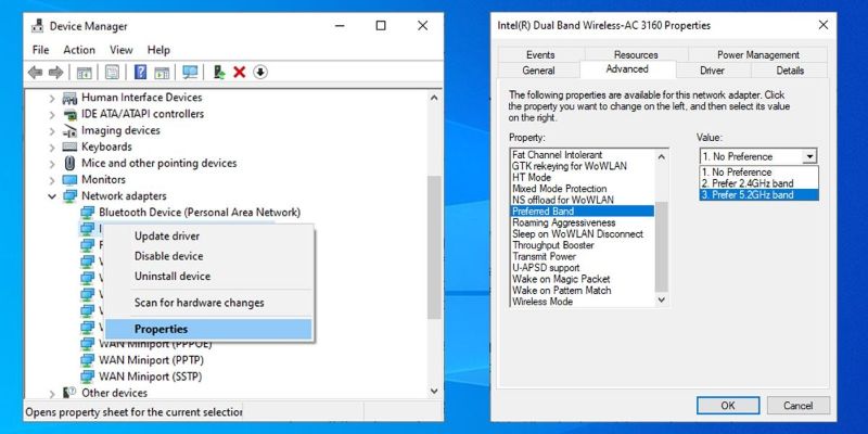 - Đặt Property (Thuộc tính) thành Band (Băng tần) hoặc Preferred band (Băng tần ưa thích). Tùy chọn này có thể có tên khác tùy thuộc vào nhà sản xuất bộ điều hợp.