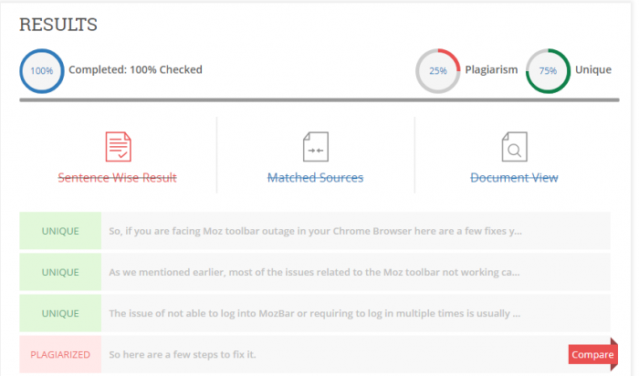 Small SEO Tools sẽ hiển thị tỷ lệ phần trăm nội dung bị sao chép trong văn bản của bạn. Ví dụ, nếu tỷ lệ đạo văn là 25%, nghĩa là có 25% nội dung của bạn trùng lặp với các nguồn tài liệu khác trên internet.