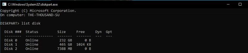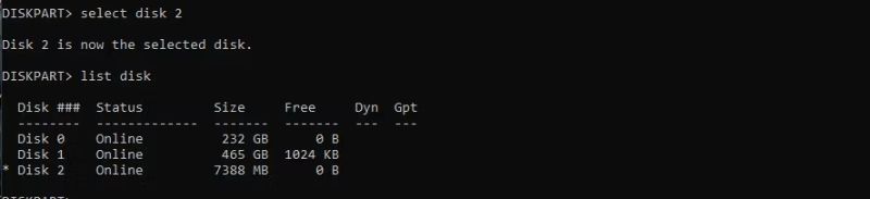Bạn sẽ thấy một thông báo xác nhận rằng ổ lưu trữ của bạn đã được chọn. Để xác minh điều này, hãy gõ list disk và nhấn enter. Danh sách hiện ra sẽ đánh dấu ổ đĩa được chọn bằng dấu hoa thị (*) phía trước số của nó