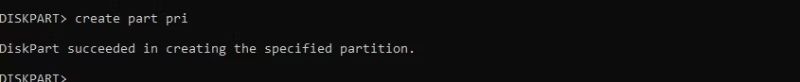Trong ví dụ này, chúng tôi sẽ chỉ phân vùng ổ đĩa thành một khối lưu trữ. Vì vậy, hãy nhập create partition primary (tạo phân vùng chính) hoặc create part pri (tạo phần pri) và nhấn Enter. Thao tác này sẽ phân vùng ổ đĩa thành một khối.