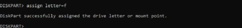 Nhập assign letter=DRIVE-LETTER, thay thế DRIVE-LETTER bằng “f” và nhấn Enter. Bạn sẽ nhận được một thông báo xác nhận cho bạn biết rằng chữ cái đã được chỉ định cho ổ đĩa.