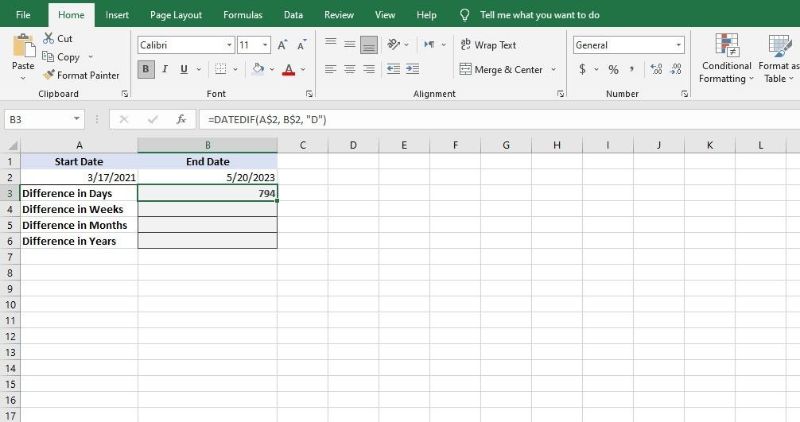 Công thức sẽ tính toán sự khác biệt giữa các ngày trong ô A1 và B2, sau đó xuất kết quả theo ngày. Các tham chiếu tuyệt đối ($) đảm bảo rằng sau khi bạn tự động điền công thức vào các ô bên dưới, A2 và B2 sẽ không đổi.