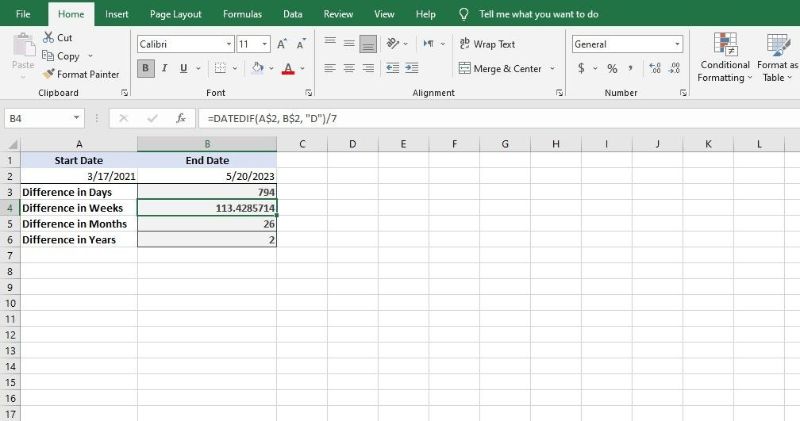 Khi bạn điền vào các ô khác, bạn chỉ cần thay đổi đơn vị. Để tính chênh lệch theo tuần, bạn có thể chia công thức ngày cho bảy: