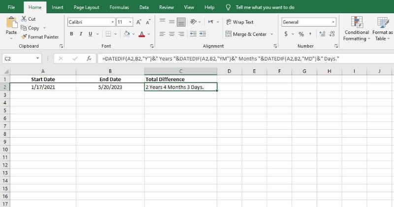Bây giờ bạn sẽ thấy một kết quả cho bạn biết thời gian chính xác đã trôi qua giữa hai ngày. Công thức ở đây bao gồm ba trường hợp của DATEDIF.