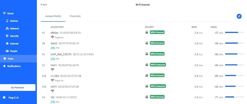 Có sẵn trên hệ điều hành Android, iOS, Windows và macOS, Fing là một công cụ nhẹ nhưng mạnh mẽ có khả năng thực hiện phân tích mạng kỹ lưỡng. Ứng dụng có một phiên bản miễn phí và một phiên bản cao cấp với các tính năng bổ sung.