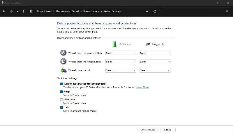 - Bây giờ bạn có thể sửa đổi các tùy chọn màu xám trước đó. Bỏ chọn Bật khởi động nhanh (Turn on fast startup)