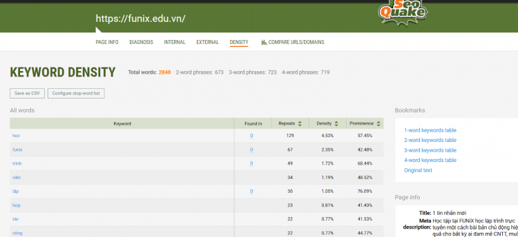 Seoquake cũng cung cấp thông tin về mật độ từ khóa (Keyword Density) trên trang web. Đây là tỷ lệ phần trăm của số lần một từ khóa xuất hiện trong nội dung so với tổng số từ trong trang.