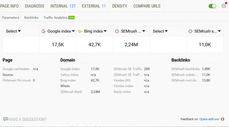 - Thẻ Parameters: cung cấp rất nhiều giá trị để so sánh tham chiếu từ rất nhiều cung cụ search khác nhau như: Google cachedate (lần cuối cùng google tạo index cho trang URL), Facebook likes, Pinterest Pin count, Linkedin share count, Google index,…