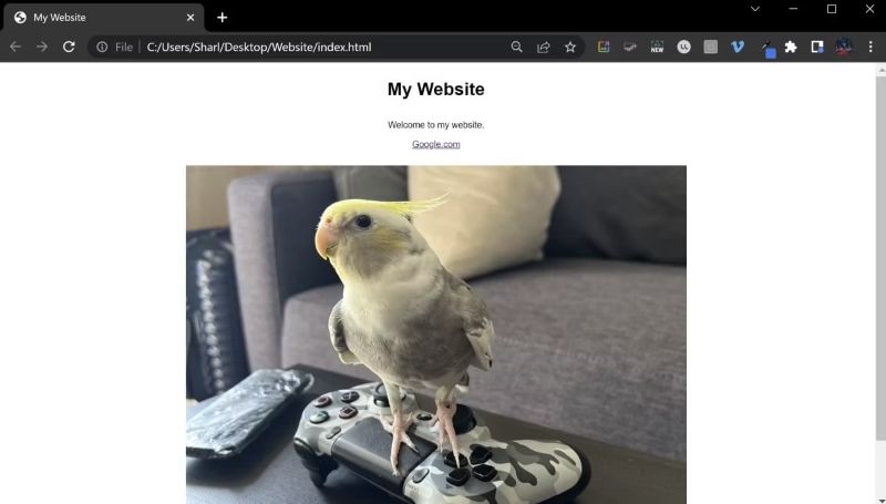 <img src="file:///C:/Users/Sharl/Desktop/Website/Images/CuteBird.jpg" alt="Cute bird photo" class="mb28" width="900" height="700"> Nhấp vào file index.html để mở tệp trong trình duyệt và xem hình ảnh được lưu trữ trên máy tính.
