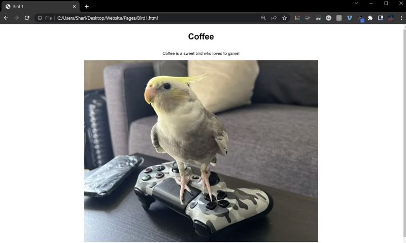 <div class="container"> <h1> My Website </h1> <p> Welcome to my website. </p> <a href="Pages/Bird1.html" class="mb28">Bird 1: Coffee</a> </div> - Nhấp vào file index.html để mở tệp trong trình duyệt và nhấp vào liên kết mới để điều hướng đến Bird1.html.
