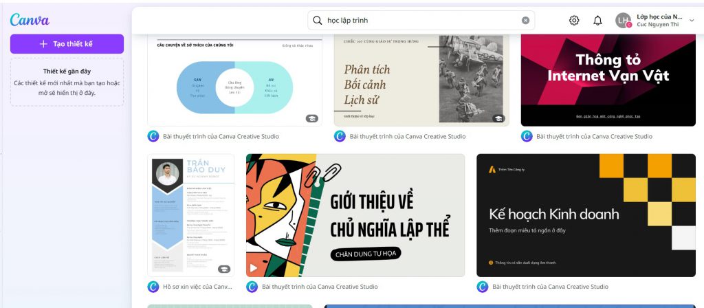 Sau khi đăng nhập, bạn sẽ được đưa vào giao diện chính của Canva. Tại đây, bạn sẽ thấy rất nhiều mẫu thiết kế cho các mục đích khác nhau, bao gồm các poster, bài đăng mạng xã hội, thẻ danh thiếp, v.v.