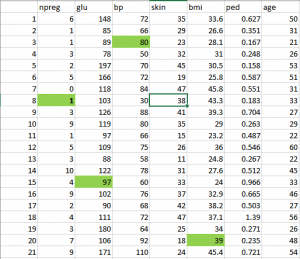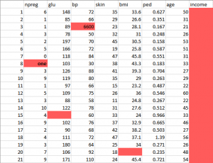 1. Trong cột npreg, “one” được viết bằng chữ, trong khi nó phải ở dạng số như 1.