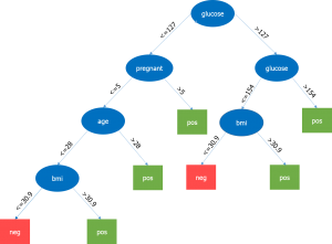 Ở đây, thông số quan trọng nhất là mức glucose, vì vậy nó là node gốc của chúng ta. Bây giờ, node hiện tại và giá trị của nó xác định tham số quan trọng tiếp theo sẽ được thực hiện. Nó tiếp tục cho đến khi chúng ta nhận được kết quả về pos hoặc neg. Pos có nghĩa là dương tính và neg có nghĩa là âm tính.