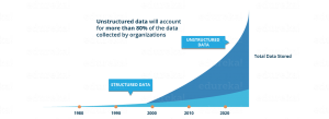• Theo truyền thống, dữ liệu mà chúng ta có hầu hết đều có cấu trúc và kích thước nhỏ, có thể được phân tích bằng cách sử dụng các công cụ BI đơn giản. Không giống như dữ liệu trong các hệ thống truyền thống chủ yếu là có cấu trúc, ngày nay hầu hết dữ liệu là không có cấu trúc hoặc bán cấu trúc. Hãy xem xu hướng dữ liệu trong hình ảnh dưới đây, vào năm 2020, hơn 80% dữ liệu sẽ không có cấu trúc.