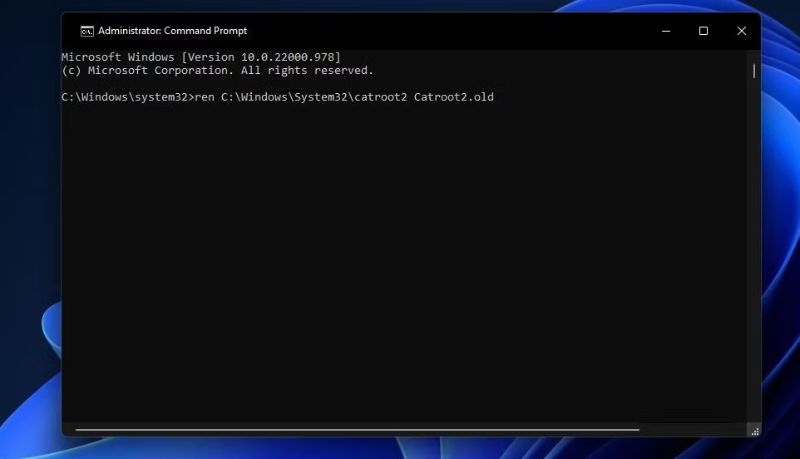 ren C:\Windows\SoftwareDistribution SoftwareDistribution.old - Gõ lệnh đổi tên catroot2 này và nhấn Return :