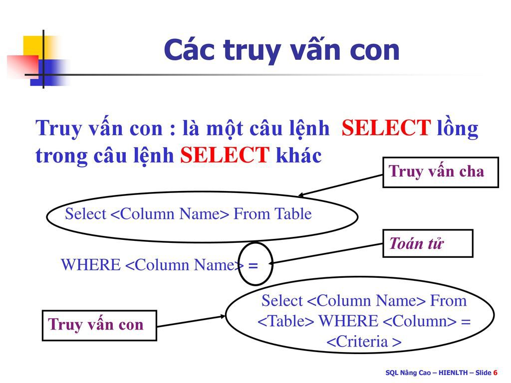 Trong mệnh đề WHERE thường có truy vấn con. Các truy vấn con này gọi là truy vấn lồng nhau hay còn được gọi là truy vấn phụ.