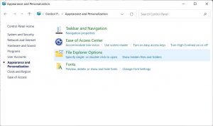 - Nhấp vào Giao diện và Cá nhân hóa> Tùy chọn Trình khám phá tệp (Appearance and Personalization > File Explorer Options).