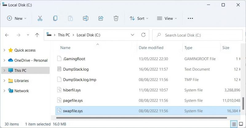 - Đi tới thư mục gốc của ổ đĩa cục bộ (ổ C) và bạn sẽ nhìn thấy Swapfile.sys.