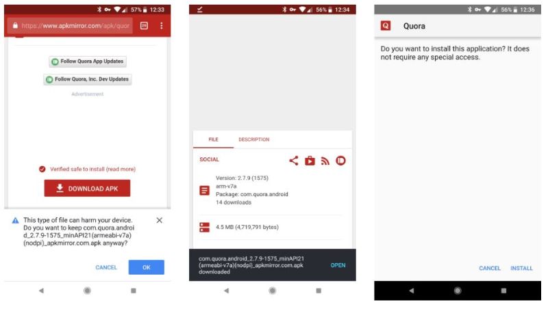 Tuy nhiên, giống như phần mềm desktop, việc tải xuống các tệp APK từ các trang web ngẫu nhiên có thể nguy hiểm. Mặc dù Google Play có các bộ lọc để phát hiện các ứng dụng nguy hiểm, nhưng không có nhiều biện pháp bảo vệ khi bạn tự cài đặt APK. Bạn có thể cài đặt phải một phần mềm độc hại được ngụy trang dưới dạng một ứng dụng hợp pháp hoặc có thể bị giả mạo để bao gồm phần mềm gián điệp.
