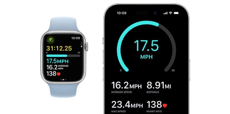 Apple cũng đã thêm các tính năng mới dành riêng cho người đi xe đạp sử dụng Apple Watch. Khi bắt đầu tập luyện Đạp xe trên đồng hồ, dữ liệu cũng sẽ xuất hiện dưới dạng Hoạt động trực tiếp (Live Activity ) trên iPhone của bạn. Nhấn vào nó sẽ hiển thị toàn màn hình các dữ liệu quan trọng.