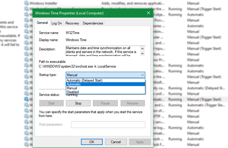 Trong cửa sổ Windows Time Properties (Thuộc tính thời gian) của Windows, đặt Startup type (Loại khởi động) thành Automatic (Tự động) . Sau đó nhấp vào Start (Bắt đầu) để đảm bảo dịch vụ đang chạy, tiếp theo là OK để lưu các thay đổi của bạn.