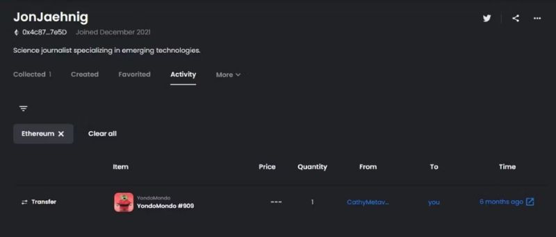 Tương tự, hầu hết các thị trường NFT đều cho phép bạn xem hoạt động của các tài khoản khác. Bằng một trong hai cách này, bạn có thể xác minh giao dịch ngay cả khi nó không liên quan gì đến bạn.