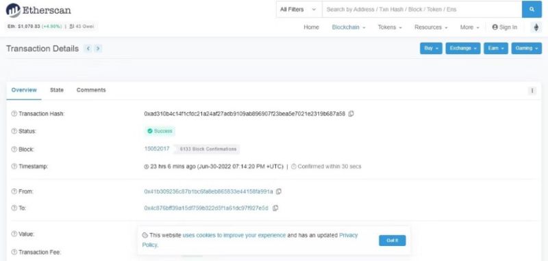 Block Explorer thậm chí còn có một thanh tìm kiếm nơi bạn có thể duyệt qua blockchain theo địa chỉ hoặc ENS, khối hoặc token cụ thể hoặc thậm chí là giao dịch riêng lẻ. Trên Etherscan, thậm chí còn có một dòng văn bản cho biết giao dịch đã hoàn tất hay chưa với dấu kiểm màu xanh lá cây xuất hiện nếu giao dịch đã hoàn tất.