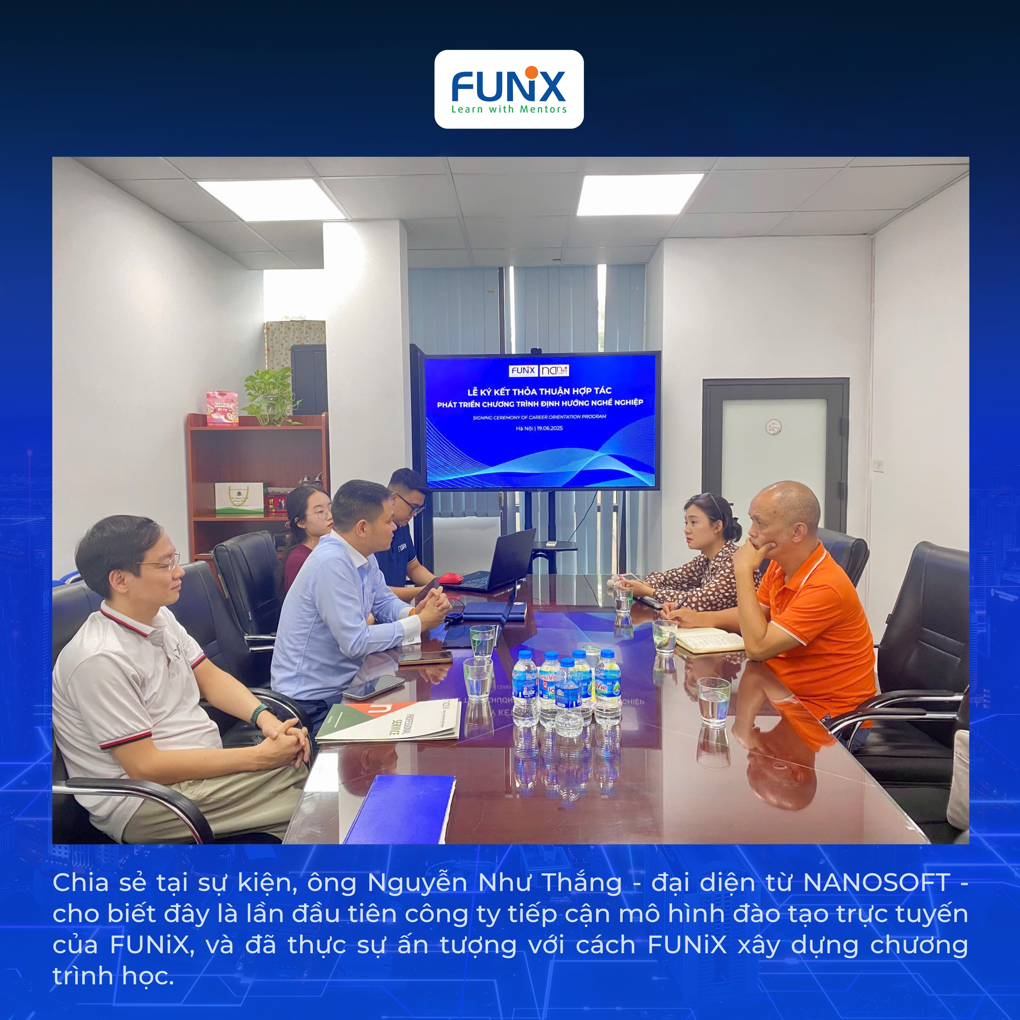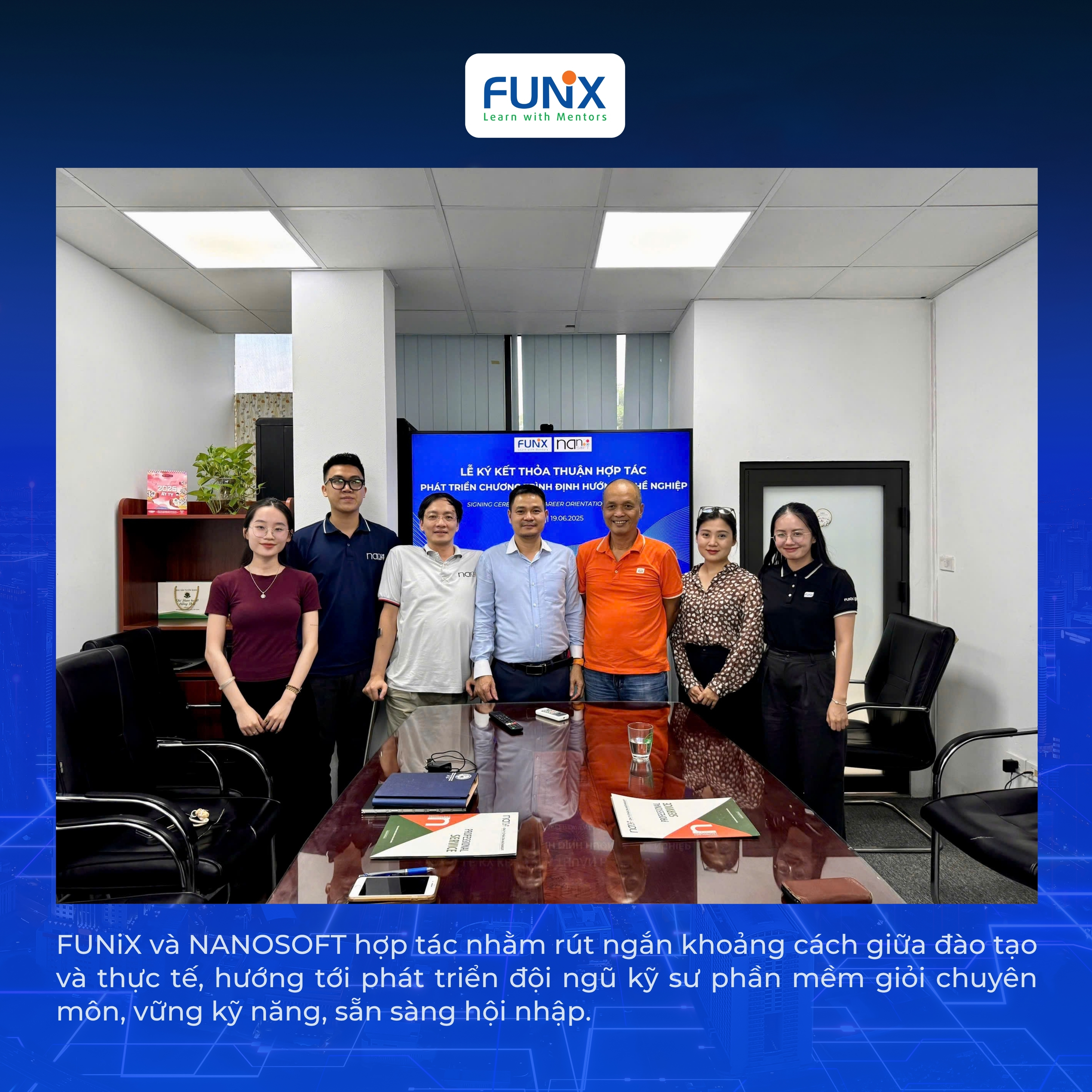 Chiều thứ năm vừa qua (19/6/2025), đại diện Tổ chức Giáo dục Trực tuyến FUNiX và Công ty Công nghệ NANOSOFT đã chính thức ký kết biên bản ghi nhớ hợp tác (MoU), đánh dấu bước khởi đầu quan trọng trong hành trình kết nối giữa giáo dục và doanh nghiệp – cùng hướng tới mục tiêu phát triển nhân lực công nghệ chất lượng cao, sát với nhu cầu thực tế.