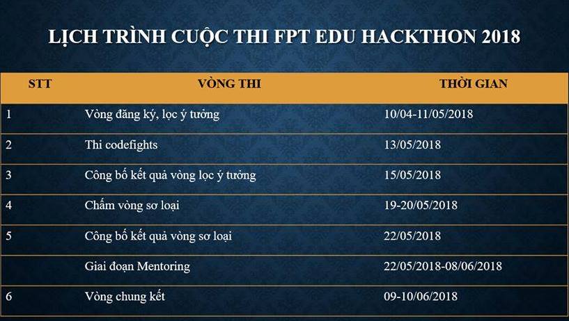 FPT Edu Hackathon 2018 là cuộc thi lập trình dành cho học sinh, sinh viên thuộc 03 miền của Tổ chức giáo dục FPT (FPT Edu), được tổ chức theo mô hình Hackathon nổi tiếng của thế giới. Thách thức của cuộc thi nằm ở việc các thí sinh phải phát triển một sản phẩm công nghệ trong thời gian ngắn, cạnh tranh về tốc độ, độ sáng tạo và tính hoàn thiện của ứng dụng, nhằm giải bài toán được cuộc thi đặt ra. Theo thông tin từ BTC, các nhóm có thể lựa chọn bất kỳ công nghệ nào miễn là nó giải quyết tốt bài toán đặt ra và thuận lợi nhất cho người dùng, cho nhóm khi phát triển. Các ngôn ngữ lập trình sử dụng đa dạng, như: Java, C#.Net, PHP, Python…