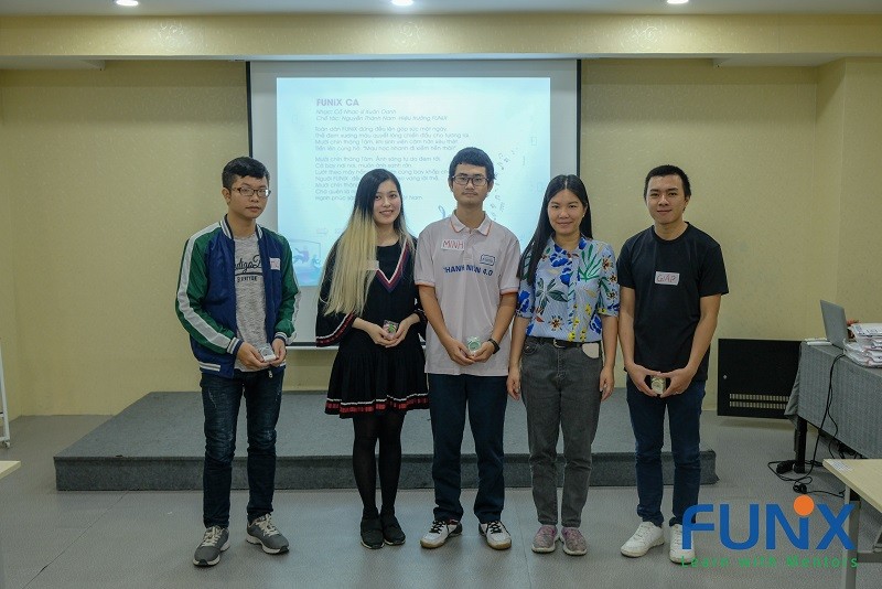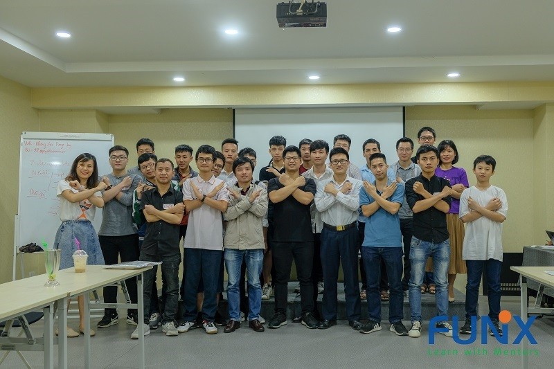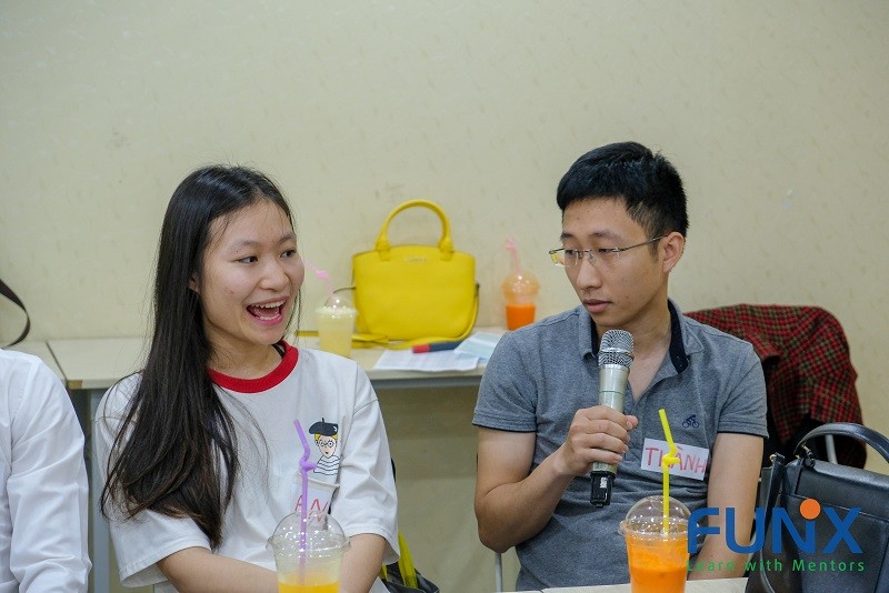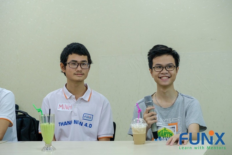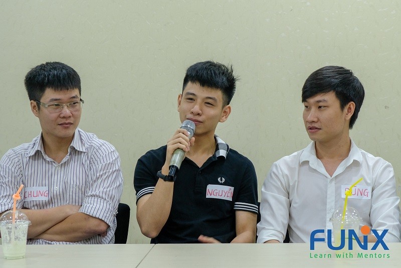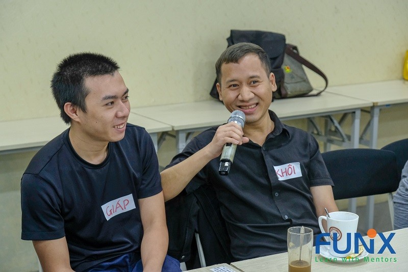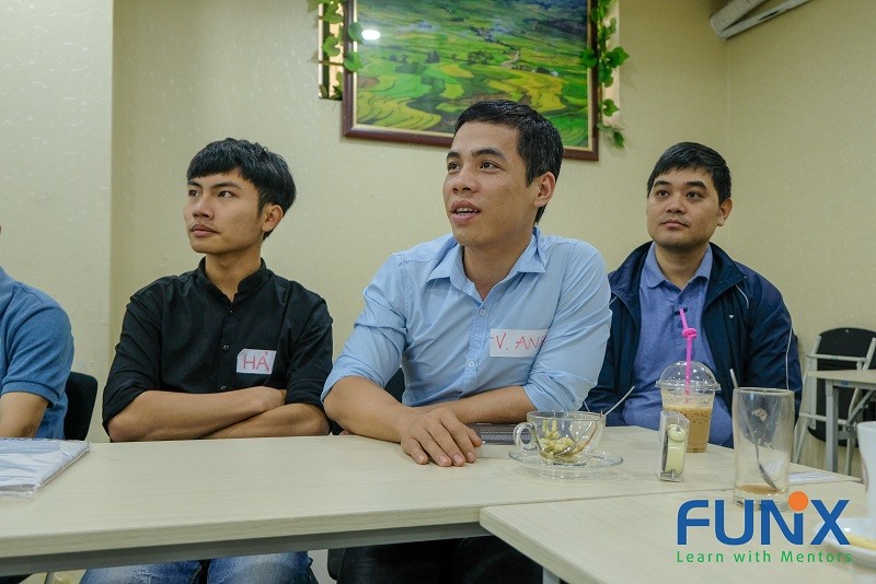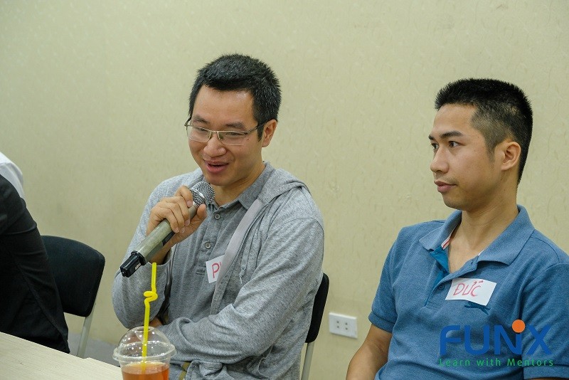 Anh Trần Việt Phú (1986 Hà Nội) (áo xám), hiện anh đang làm nghiên cứu khoa học (lò phản ứng hạt nhân), anh Phú cho biết: ” Sẽ cần các công cụ Lập trình để tạo ra các chương trình điện toán, thứ 2, việc học Lập trình sẽ tạo nhiều cơ hội, đông thời cập nhật những kiến thức mới về AI để giúp cho công việc hiện tại”. Ngồi bên cạnh là xTer Trần Minh Đức (1988) đăng ký học FUNiX khóa Automotive bắt đầu từ cuối tháng 3, Đức hi vọng sẽ có nhiều cơ hội mở mang hơn trong công việc.