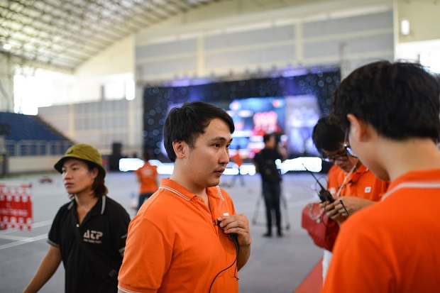 Tổ trọng tài là những người luôn theo sát các đội tuyển, đưa ra các quyết định sáng suốt trong trận bán kết. Anh Lê Ngọc Tuấn, Trưởng phòng IoT Tập đoàn FPT, là trưởng ban trọng tài. Anh đánh giá rất cao tinh thần của các đội thi, trong đó có các đội mới như Trường Thông tin liên lạc. Theo anh, kết quả thi đã phản ánh đúng thời gian, công sức các đội đã bỏ ra. Hi vọng ở vòng cuối, các đội sẽ đầu tư thời gian nhiều hơn nữa cho chiếc xe. Ảnh: Anh Dũng.