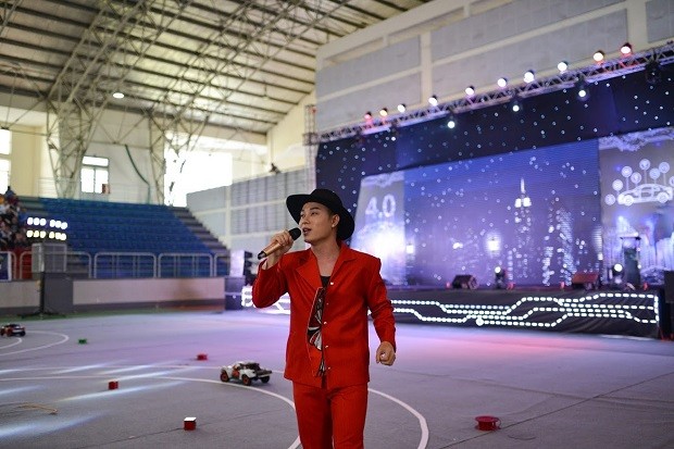 Ca sĩ Trúc Nhân góp vui cùng các bạn sinh viên với 3 ca khúc nổi tiếng “Thật bất ngờ”, “4 chữ lắm” và “Ngồi hát đỡ buồn”. Anh cho biết mình đã rất bất ngờ khi nhìn thấy sa hình và các mô hình xe xuất hiện tại chương trình. Ảnh: Anh Dũng.
