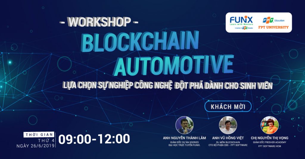Nhằm mang đến cho sinh viên cơ hội tiếp cận những kiến thức về hai lĩnh vực Blockchain và Automotive – hai công nghệ đột phá trong Cách mạng 4.0 và có nhiều triển vọng thành công, FUNiX phối hợp với Đại học FPT HCM tổ chức buổi Workshop, chủ đề: “Blockchain, Automotive – Lựa chọn sự nghiệp công nghệ đột phá dành cho sinh viên” vào 9h00 – 12h00 thứ 4, ngày 26/6/2019.