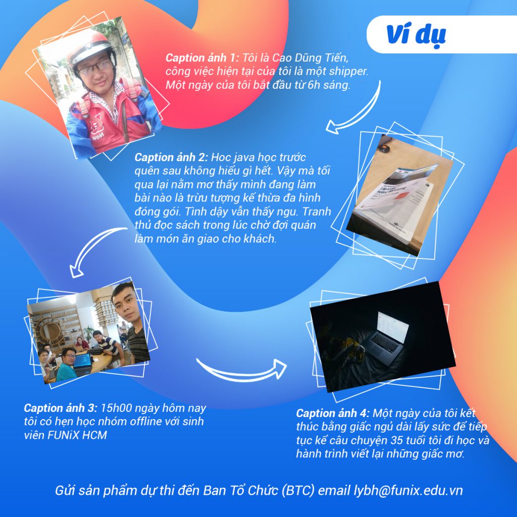 Để dự thi cuộc thi “FUNiX – My Study Life”, người tham gia chỉ cần chụp ảnh hoặc video và gửi về cho FUNiX qua email lybh@funix.edu.vn. Nếu là ảnh chụp, gồm một hoặc nhiều ảnh, mỗi ảnh có một đoạn câu chuyện dưới dạng caption, tối đa 5 ảnh. Nếu là video thời lượng tối đa 2 phút 30 giây.