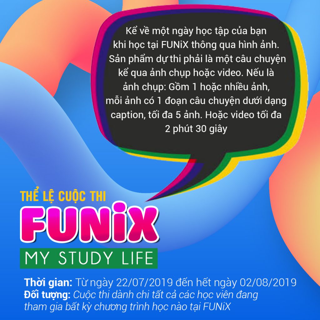 “FUNiX – My Study Life” là cuộc thi do FUNiX tổ chức, với mong muốn tạo ra sân chơi cho sinh viên kể về một ngày học tập của chính mình trong quá trình học lập trình trực tuyến tại FUNiX thông qua hình ảnh hoặc video.